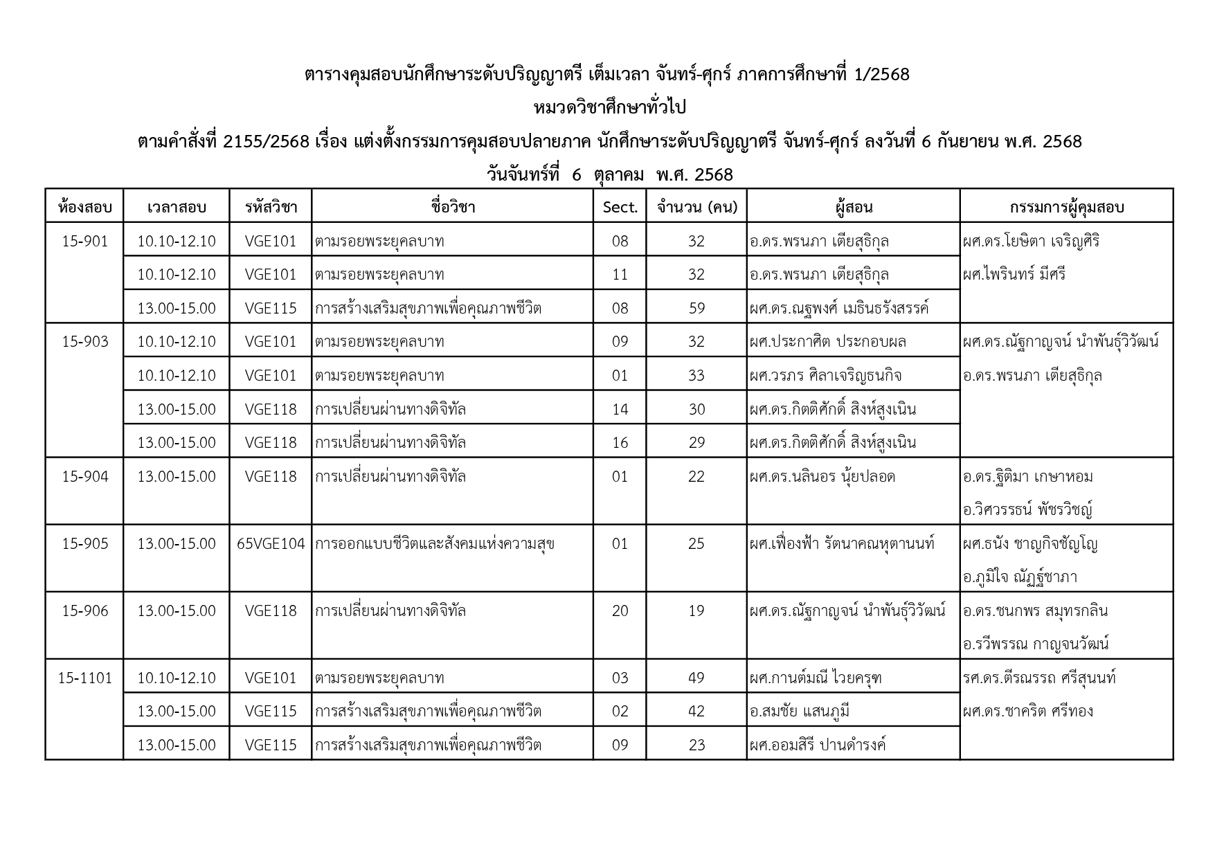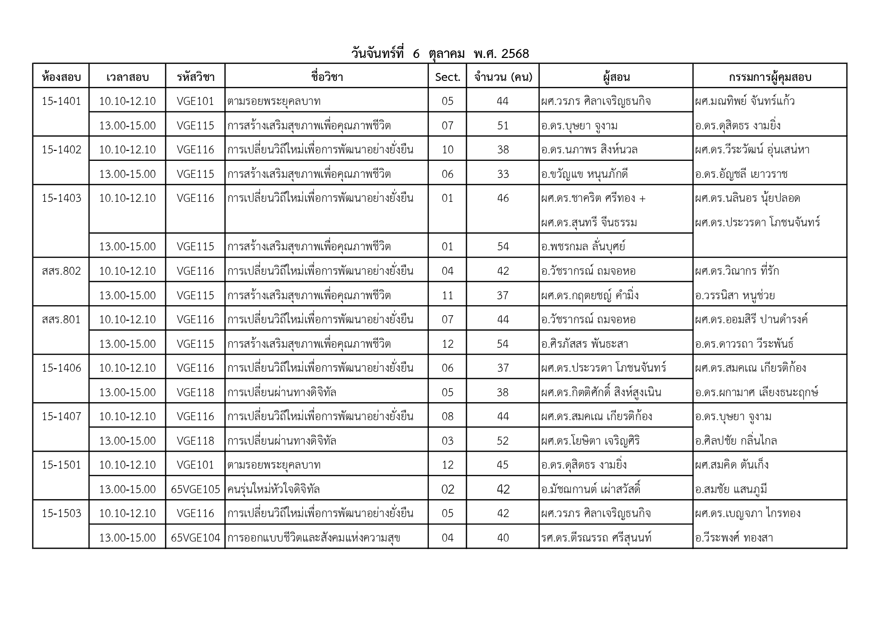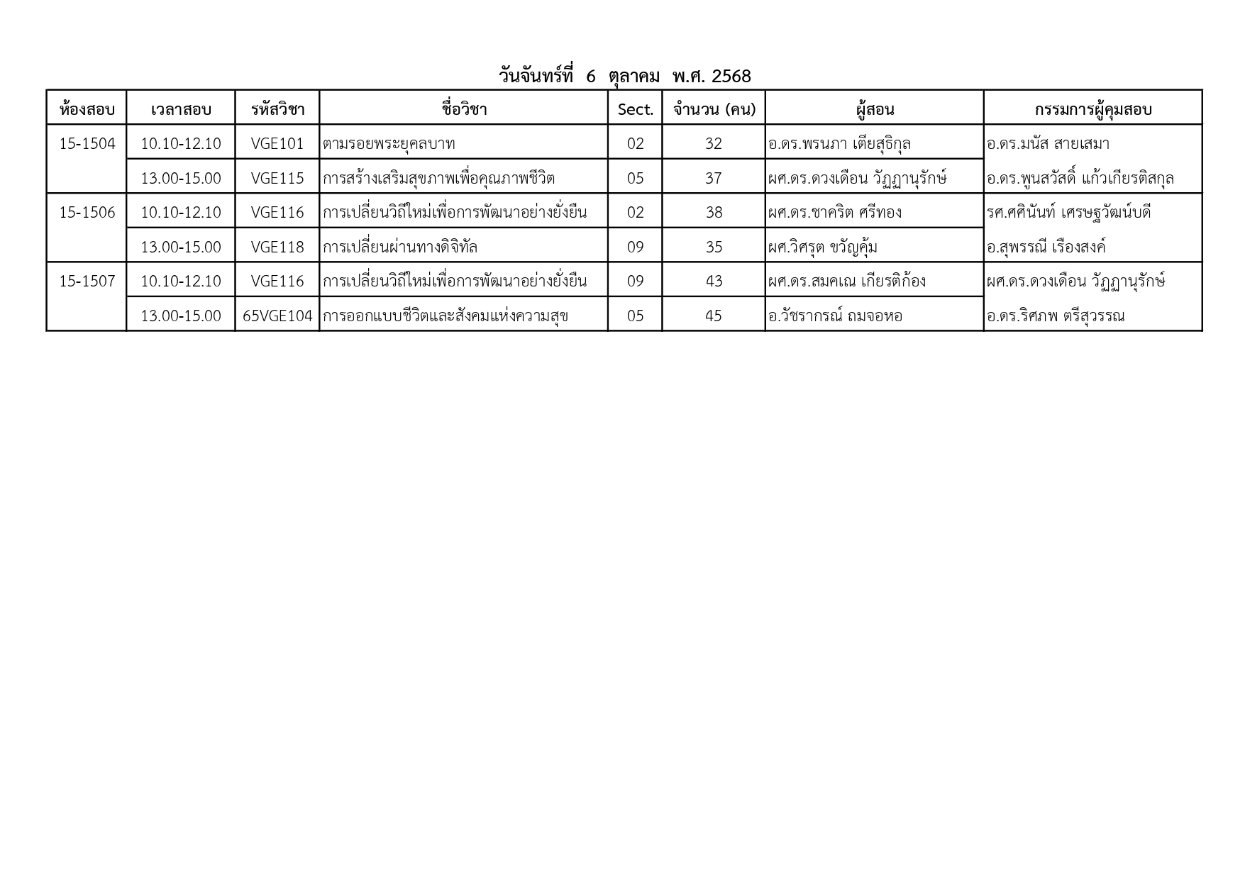 ตารางสอบวันจันทร์ที่ 6 ตุลาคม 2568