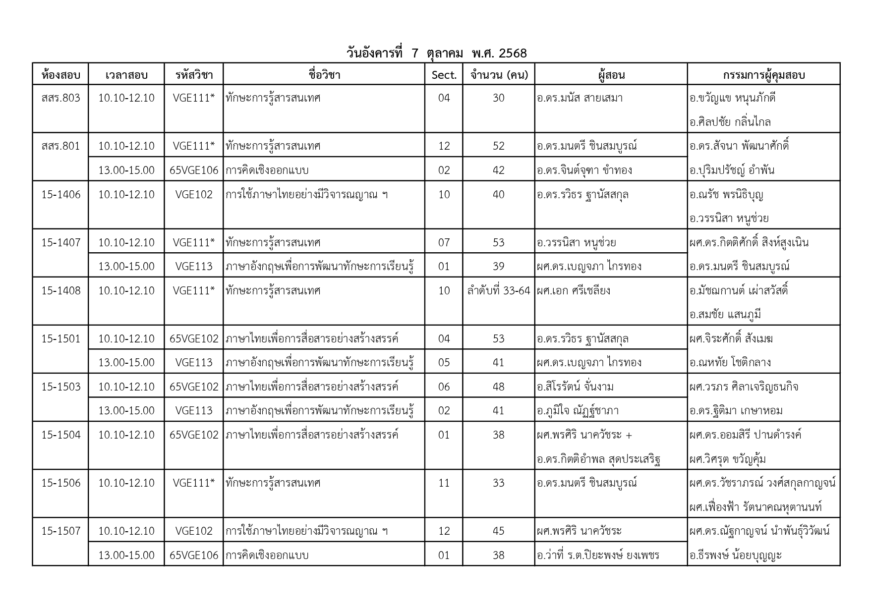 ตารางสอบวันอังคารที่ 7 ตุลาคม 2568